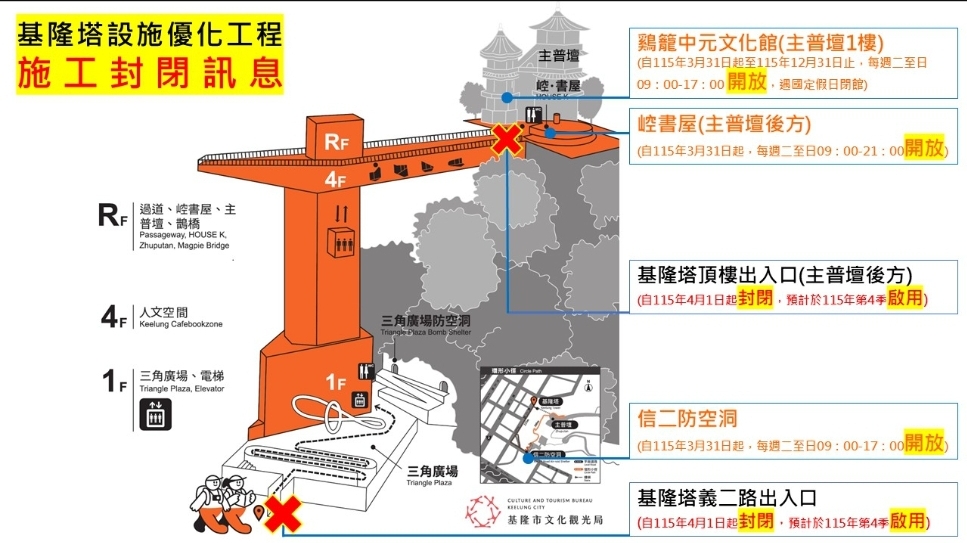為了提升文化觀光旅遊服務品質並加強遊客安全,基隆塔將自 115年4月1日起閉館,進行設施優化工程及玻璃帷幕鋼構清潔作業。預計於 115年第4季啟用,後續將視工程進度於本局官網公告重新開放時間,造成不便,敬請見諒。